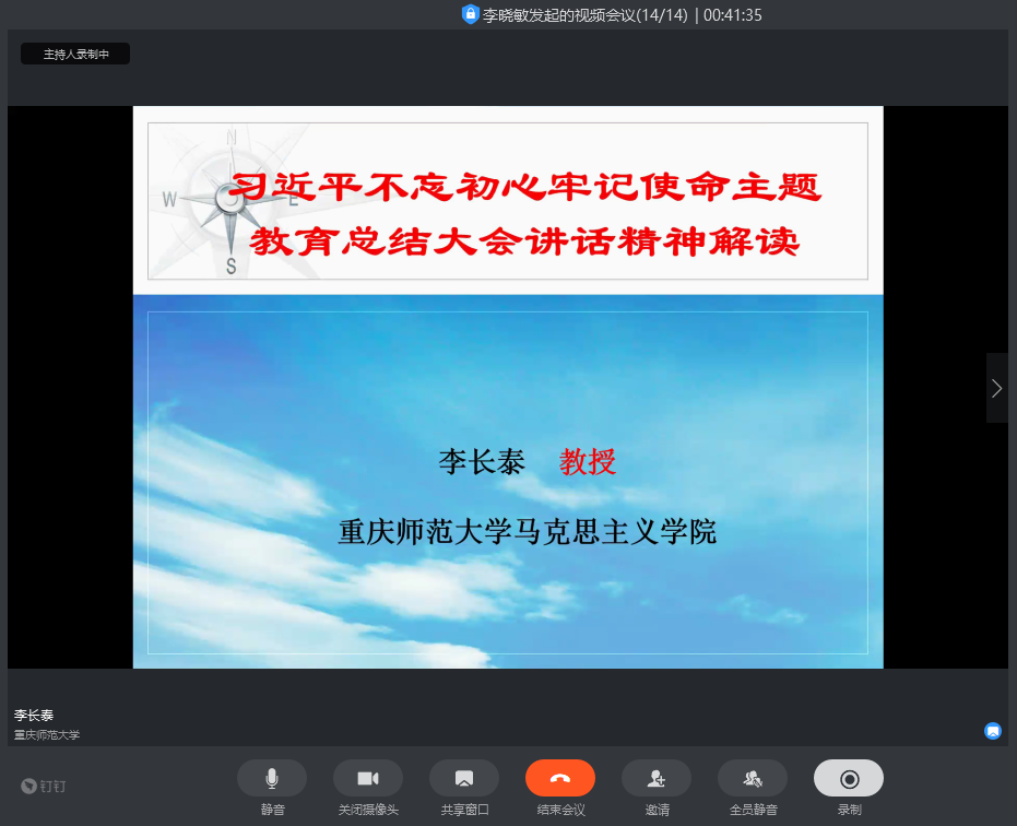 按照学校和公司党委部署要求——面向全体党员师生常态化开展党员教育“七个一”活动,2020年7月9日下午一点半,马克思主义基本原理概论党支部(简称马基原支部)通过钉钉会议召开了“党员教育‘七个一’活动”系列之一:以“党课开讲啦”为形式的党日活动。支部全体成员到会,本次活动由支部书记李长泰教授主持。