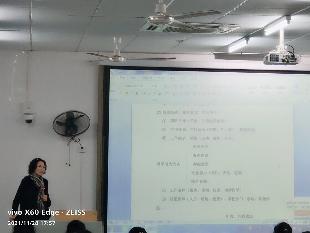 员工干部是学校员工中的骨干,是学校联系员工的纽带。为了帮助同学们更加深入地了解员工干部的工作,同时明确员工干部的应尽职责,提高员工干部的整体素质,更好地发挥“纽带”的作用,加强员工队伍的凝聚力,战斗力,2021年11月28日17时,公司于励志楼12410教室为2021级新生做以“员工干部能力素质与服务意识培训”为主题的指导讲座。本次讲座由学院团委书记,2021级辅导员马小又老师担任主讲人。2021级全体同学认真聆听,虚心学习。